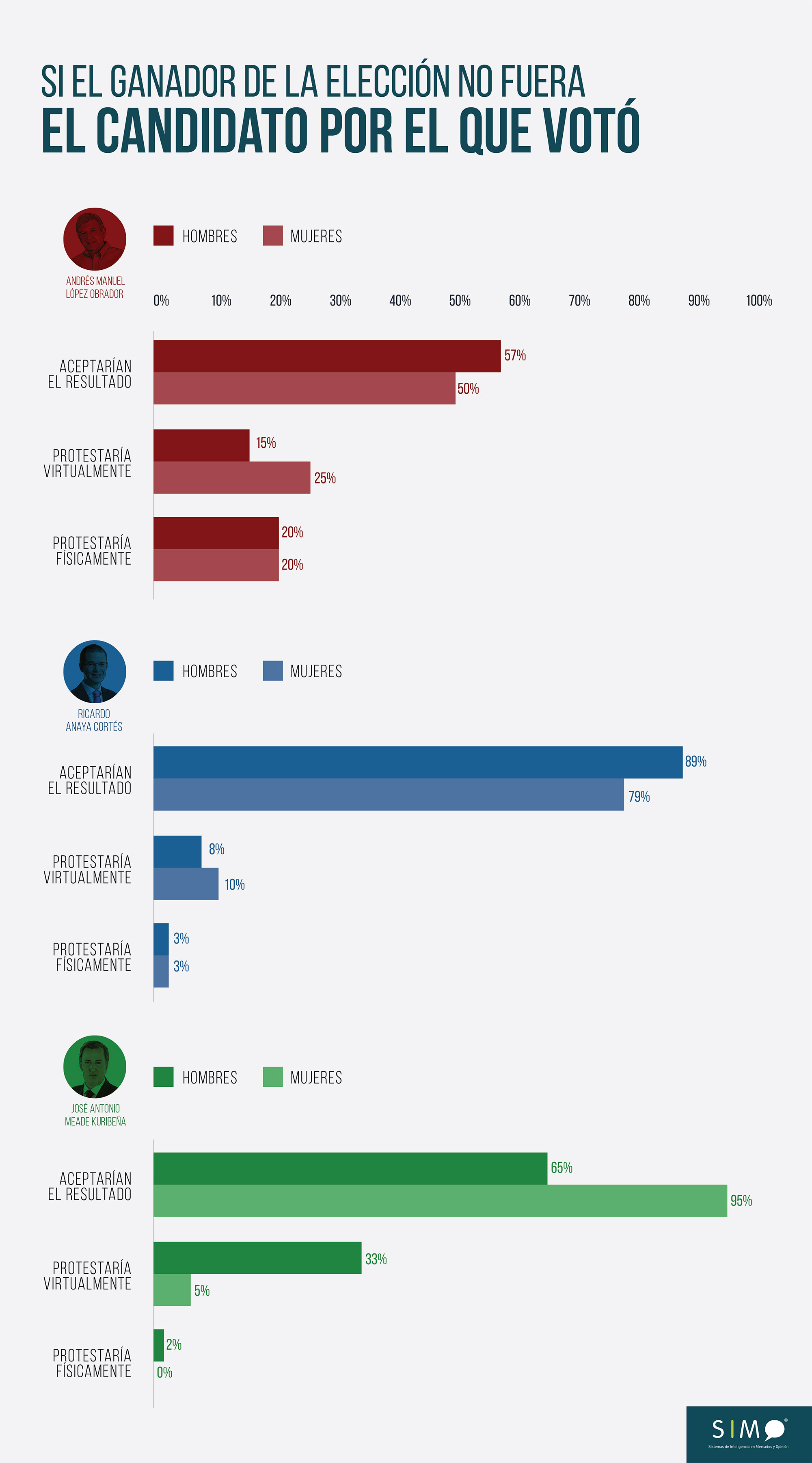En el rango de edad de primeros votantes (18-25 años), el 57% de los hombres que votaron por López Obrador respondieron que aceptaría el resultado, 15% protestaría virtualmente y el 20% lo haría físicamente. En cambio, el 50% de las mujeres aceptaría los resultados, 25% protestaría virtualmente y 20% lo haría físicamente.