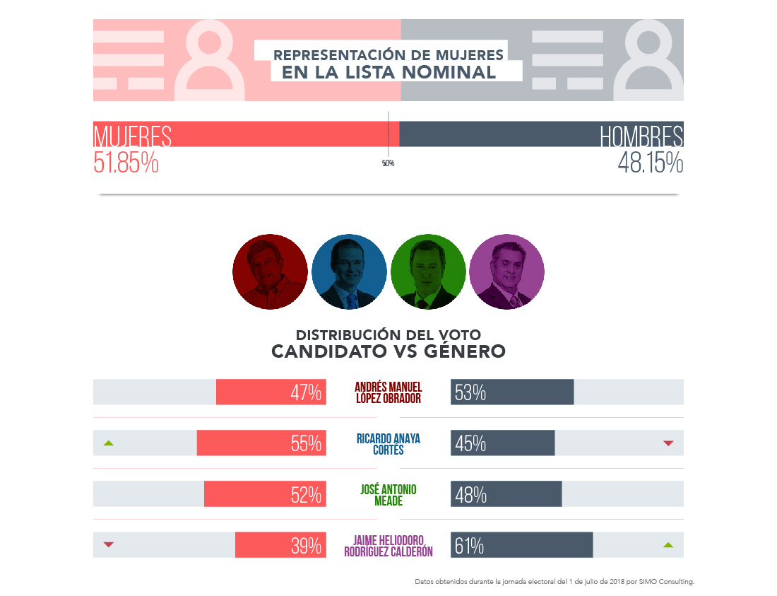 Según el Instituto Nacional Electoral (INE), las mujeres representan el 51.85% de la lista nominal de electores publicada por esta institución y los hombres el 48.15%. De acuerdo con datos de la encuesta de salida realizada por SIMO Consulting durante la jornada del 1 de julio, del total de personas encuestadas que votaron por Andrés Manuel López Obrador de la coalición Juntos Haremos Historia un 47% son mujeres y un 53% hombres. En el caso de quienes votaron por Ricardo Anaya de la coalición PAN, PRD y MC 55% de las personas que votaron por él son mujeres y 45% hombres; y de quienes votaron por José Antonio Meade el 48% son hombres y 52% mujeres.