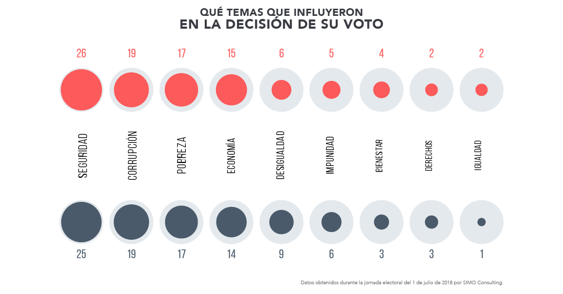 En términos generales - sin importar el candidato por el cual votaron- el tema que más les preocupa y que más motivó la elección de las mujeres fue la seguridad. El 26% de las mujeres mencionaron la seguridad como el tema principal, seguido por la corrupción con un 19%, y por último la pobreza mencionado por el 17%. Los hombres coincidieron en el tema de la seguridad como su principal preocupación y motivador del voto con un 25% del total de sus menciones. Sin embargo, es innegable que cuando las mujeres hablan de seguridad hacen referencia tanto a sus percepciones como a las manifestaciones de inseguridad que son muy distintas a las de los hombres, especialmente en un país como México.