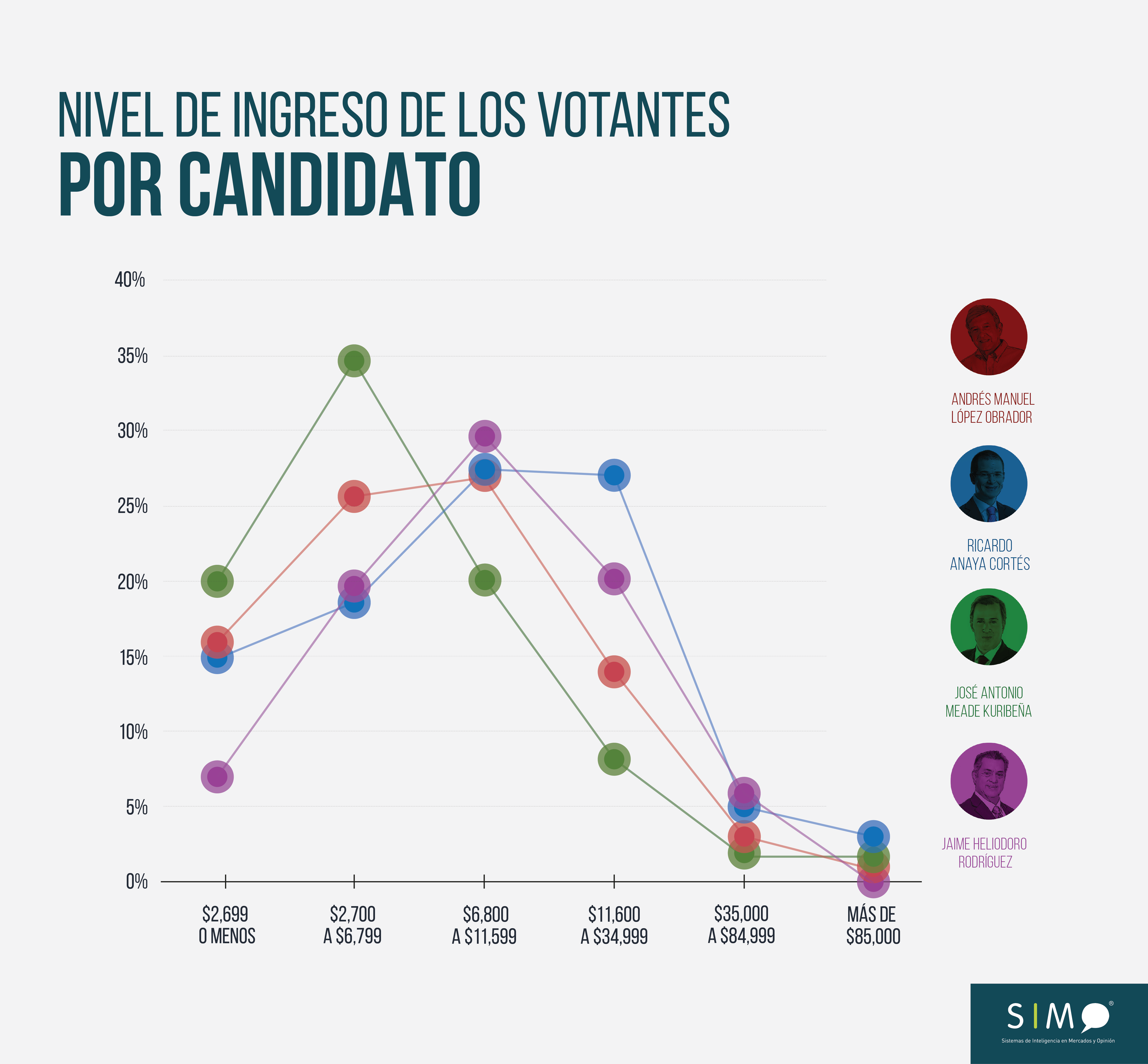 El perfil de votantes de AMLO está dominado por la clase media-baja. El del PRI también, pero no así el de su principal rival en esta elección, Anaya, cuya estructura socio-económica del voto está sensiblemente más escorada hacia el medio. Aún así, AMLO ha mantenido una cierta transversalidad (probablemente apoyada en la preocupación generalizada por la corrupción) que le ha ayudado a redondear sus cifras electorales. Para lo cual ha sido clave la consolidación de una campaña eficaz.