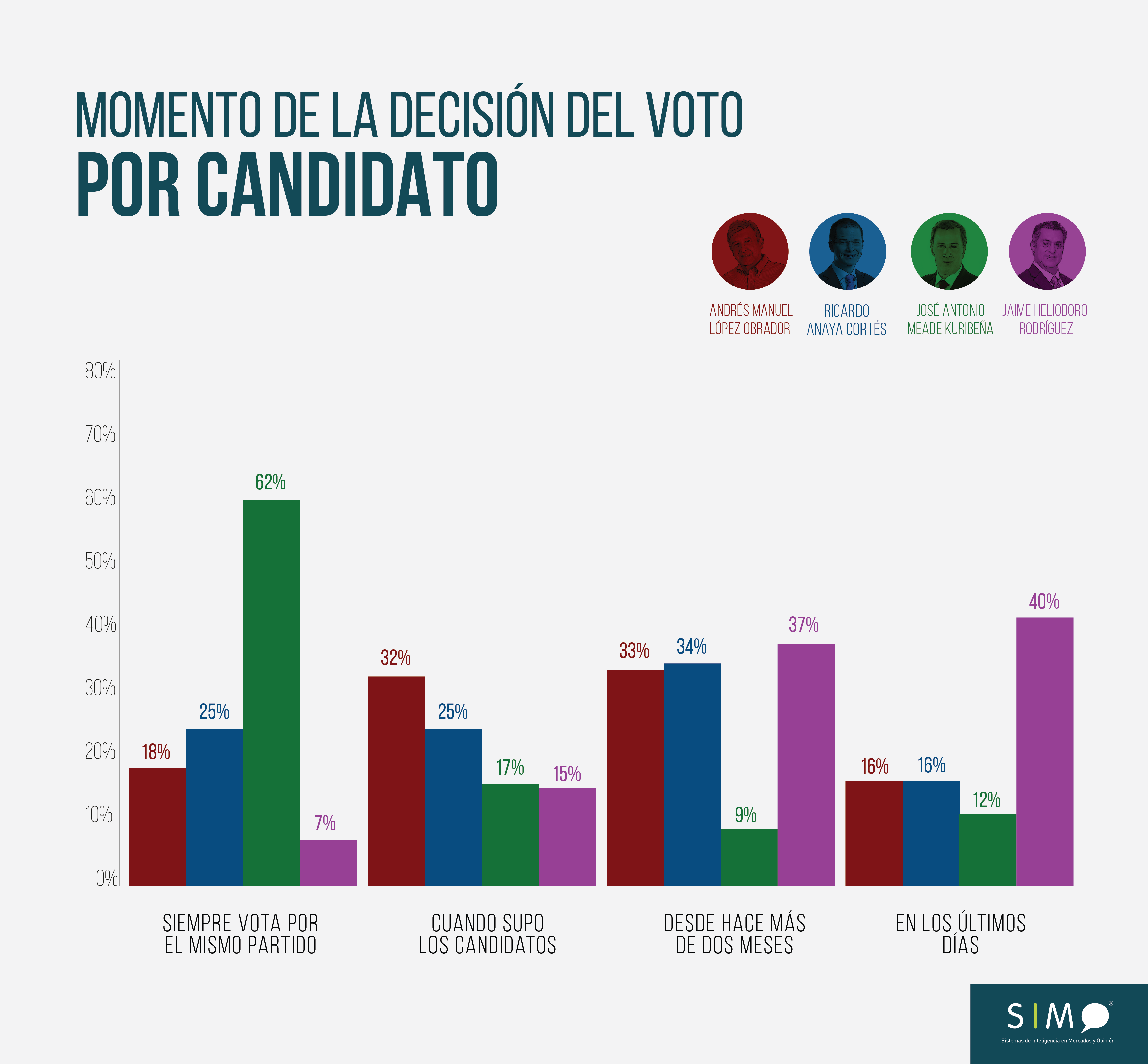 Como consecuencia, aquellos que se fueron con AMLO lo decidieron en su mayoría en el momento de la proclamación de su candidatura, así como en la primera parte de la campaña. Una dinámica que contrasta en parte con la de Anaya, quien contaba con una base algo más sustanciosa y cuya candidatura no despertó tanto interés como la de Andrés Manuel. ‘El Bronco’, por su lado, tuvo una carrera de recta final ayudada probablemente por sus estrafalarias intervenciones en la arena pública. Pero la mayor diferencia se da con Meade, quien a la vista de los datos se basó ampliamente en un núcleo de votantes priístas que después no supo ampliar. Sin embargo, y a la luz de los datos, AMLO ha empleado esta campaña para consolidar la que probablemente será la base partidista más amplia de México en el siguiente ciclo electoral. Incluso por encima del histórico PRI, al cual sus noventa años de historia le pesaron más que ayudarle en esta contienda.